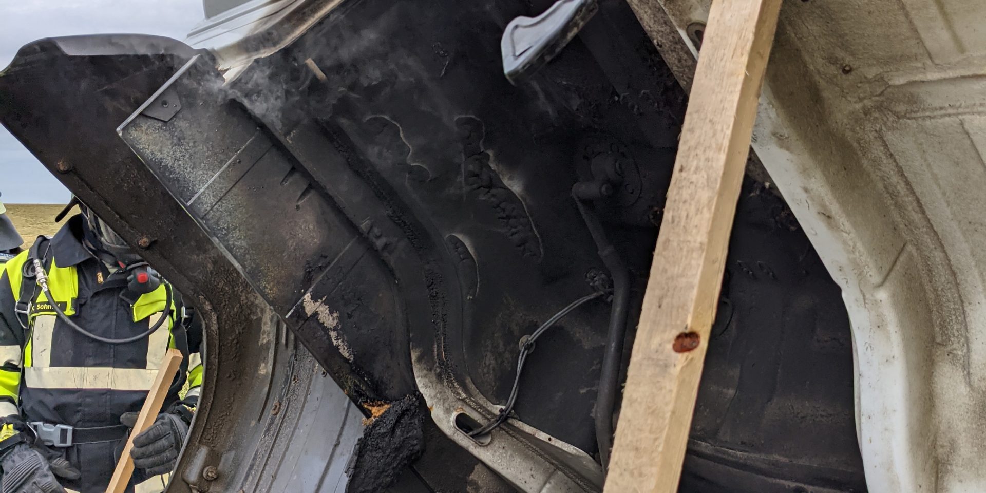 Bei einem LKW entzündete sich während der Fahrt Dämmmaterial im Motorraum. Der Brand wurde mit einem C-Rohr abgelöscht und anschließend mit der Wärmebildkamera kontrolliert.