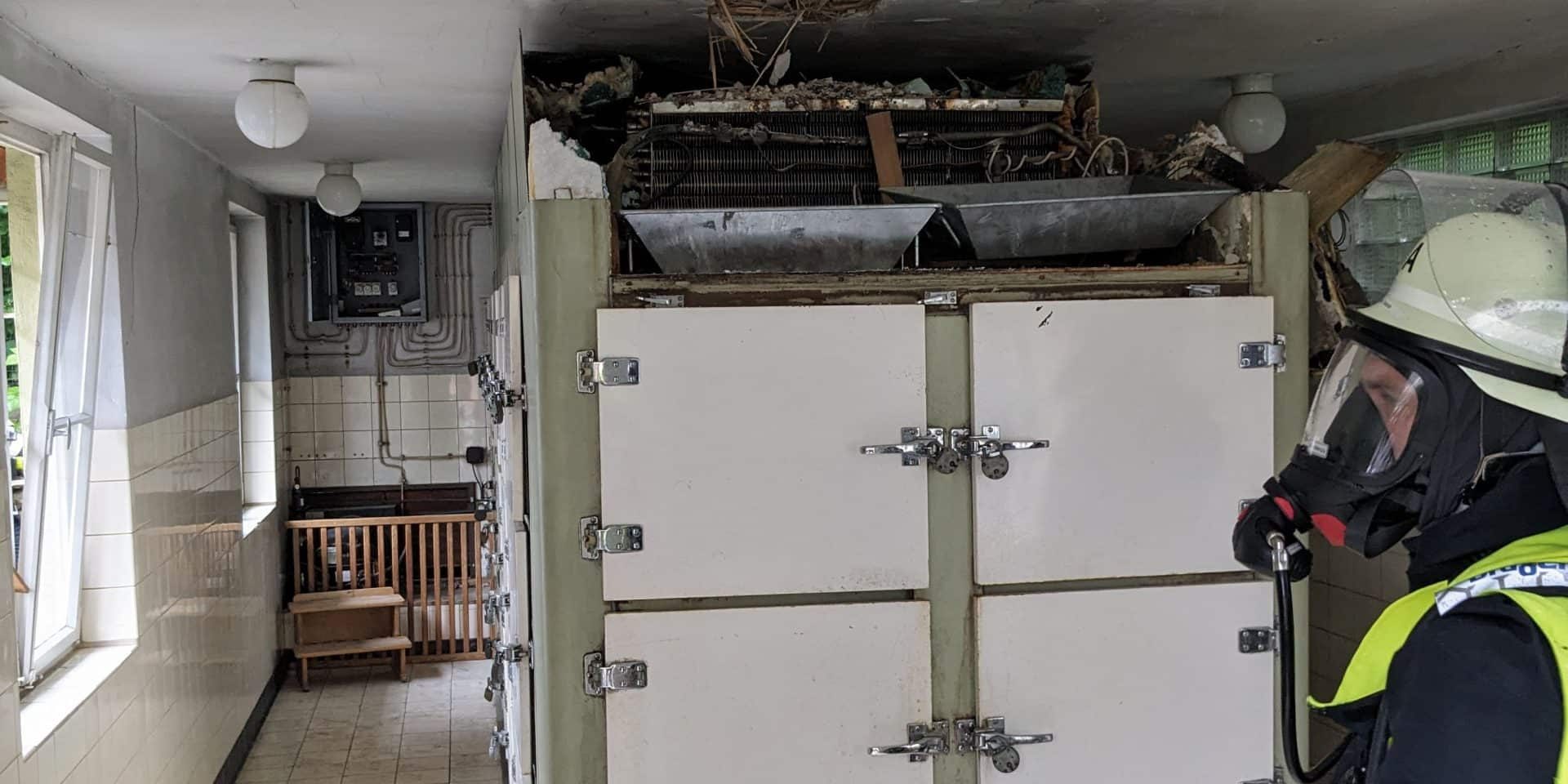 Durch einen technischen Defekt kam es zu einer Überhitzung eines Wärmetauschers. Die angeschmorten Kunststoffteile wurden abgebaut und ins freie verbracht. Da die Decke über dem Wärmetauscher stark erhitzt war, wurde diese geöffnet und kontrolliert.