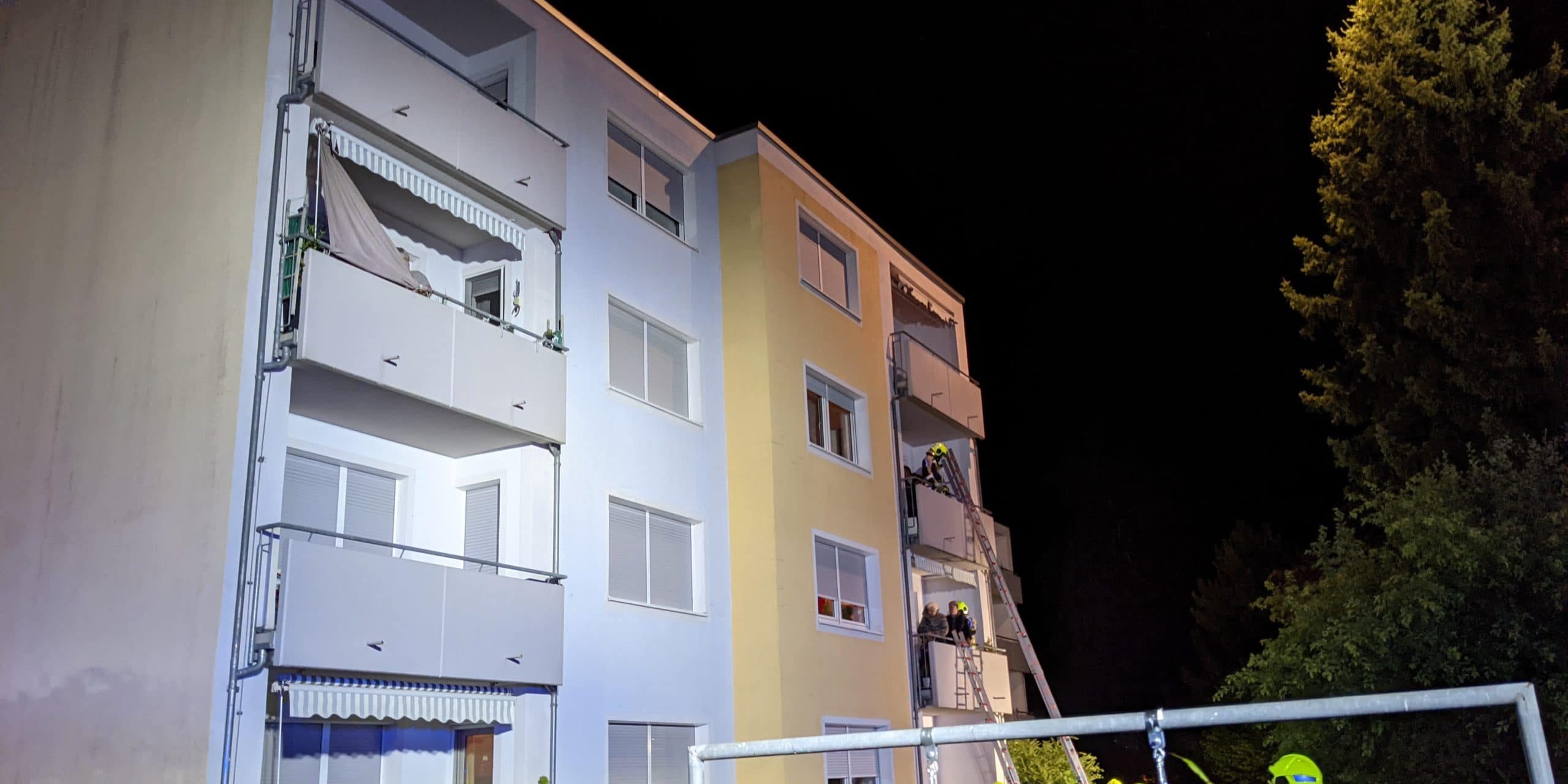 Auf der Gebäuderückseite machten sich fünf Personen auf drei verschiedenen Balkonen bemerkbar. Die Personen waren alle im rauchfreien Bereich. Die Einsatzstelle wurde in zwei Abschnitte eingeteilt. Abschnitt 1 Brandbekämpfung auf der Gebäude Vorderseite, Abschnitt 2 Menschenrettung auf der westlichen Gebäudeseite.