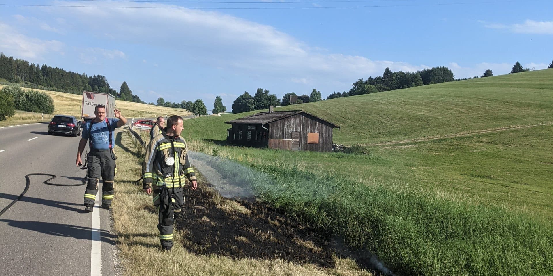 Alarmiert wurde zu einem Flächenbrand neben der B465. An drei stellen brannte der Grünstreifen, dieser wurde mittels Schnellangriff abgelöscht.
