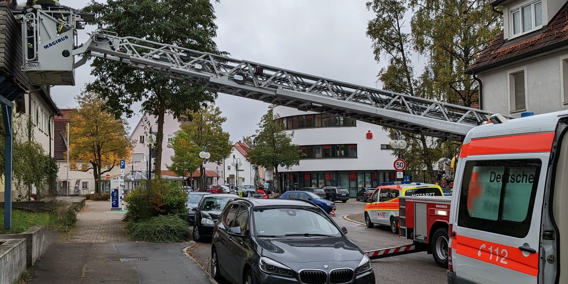 Nach einem medizinischen Notfall wurde eine Person mit Hilfe der Drehleiter aus dem Gebäude gerettet und auf den Boden verbracht.
