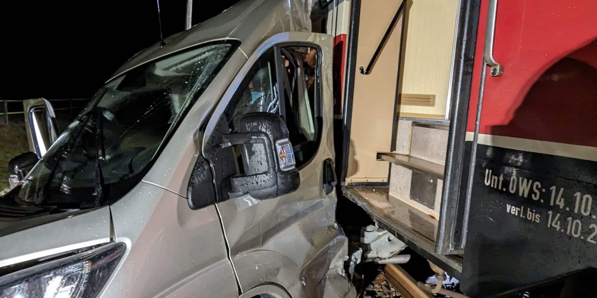 Ein Kleinbus wurde an einem unbeschrankten Bahnübergang von einem Triebwagen der SAB erfasst und ca. 50 m über das Gleisbett geschoben.