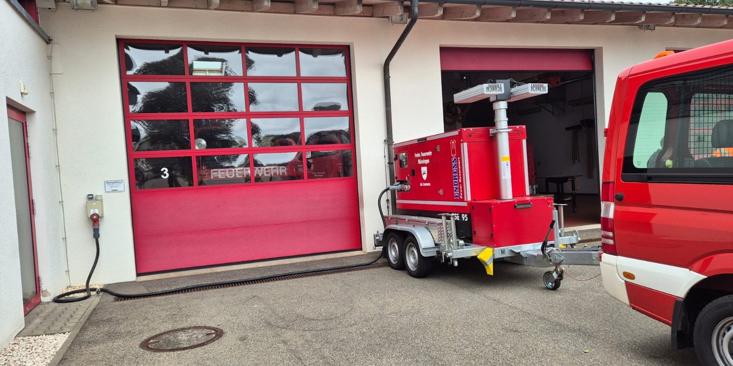 Wegen dem Stromausfall im Stadtgebiet Münsingen wurde das Feuerwehrhaus mit dem Lichtmastanhänger eingespeist.
